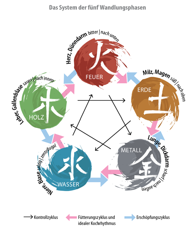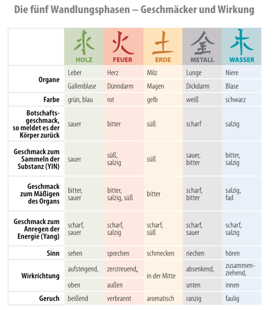 Jede Geschmacksrichtung hat eine spezifische Wirkung und Zuordnung zu den fünf Wandlungsphasen: