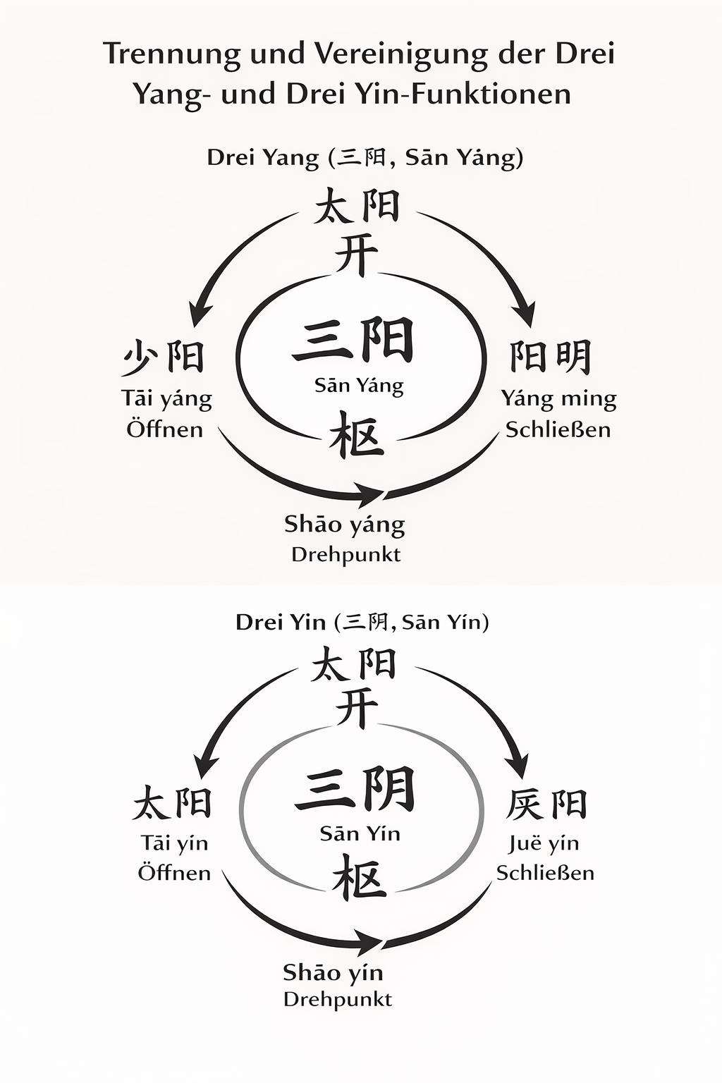 Bei der Trennung und Vereinigung der drei Yang-Elemente öffnet sich Taiyang, Yangming schließt sich und Shaoyang fungiert als Drehpunkt. Bei der Trennung und Vereinigung der drei Yin-Elemente öffnet sich Taiyin, Jueyin schließt sich und Shaoyin fungiert als Drehpunkt.